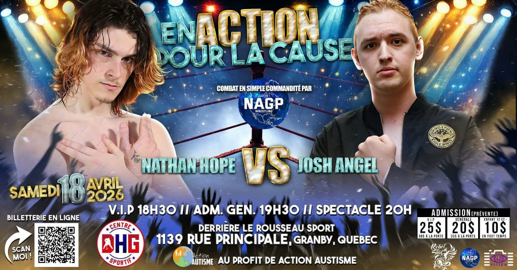 Match préliminaire commandité par NAGP Wrestling. Un gros merci pour le don, qui ira directement à Action Autisme.
