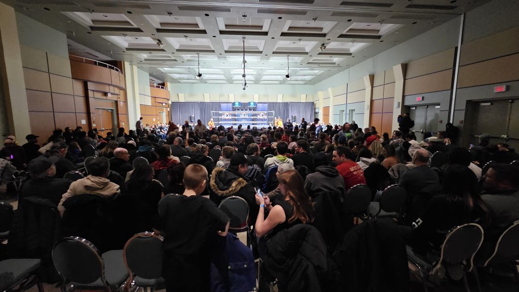 Paolo se sort d’un tombé au compte de deux. Roberge poursuit avec un brise-rein tandis que le public l’encourage.