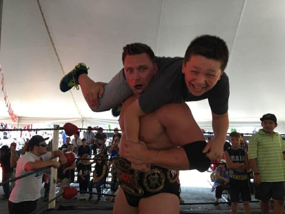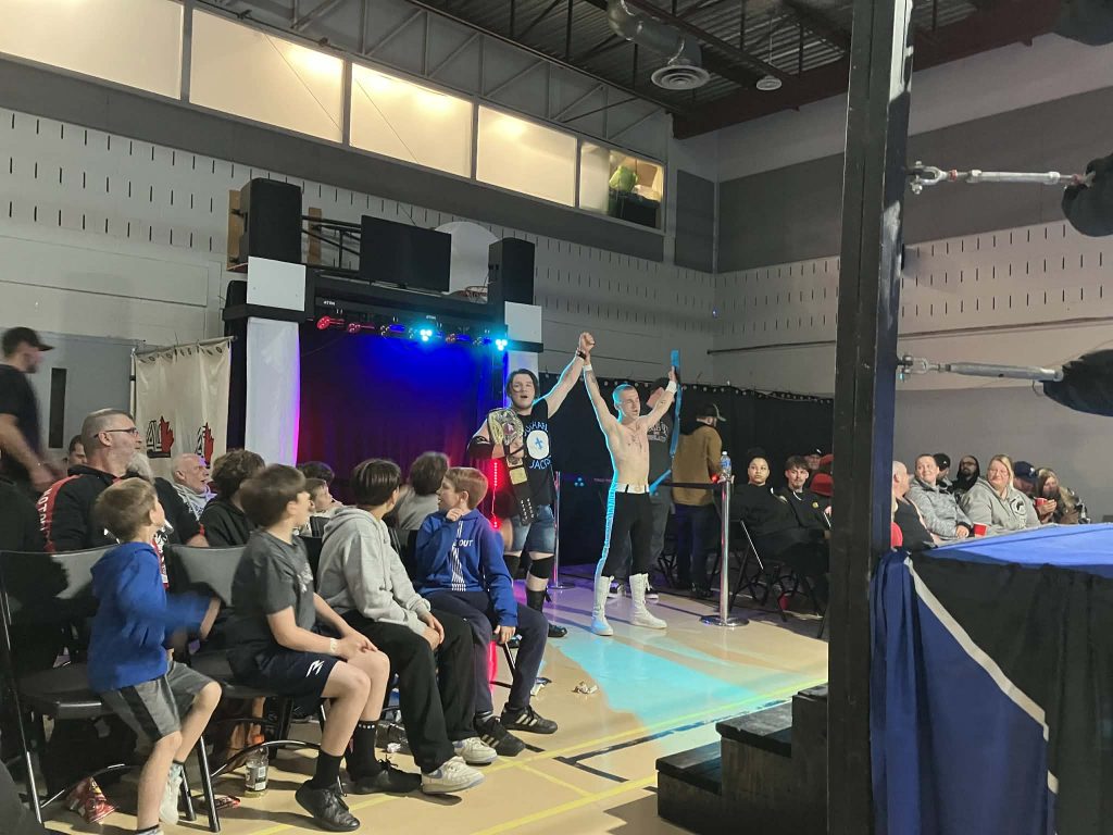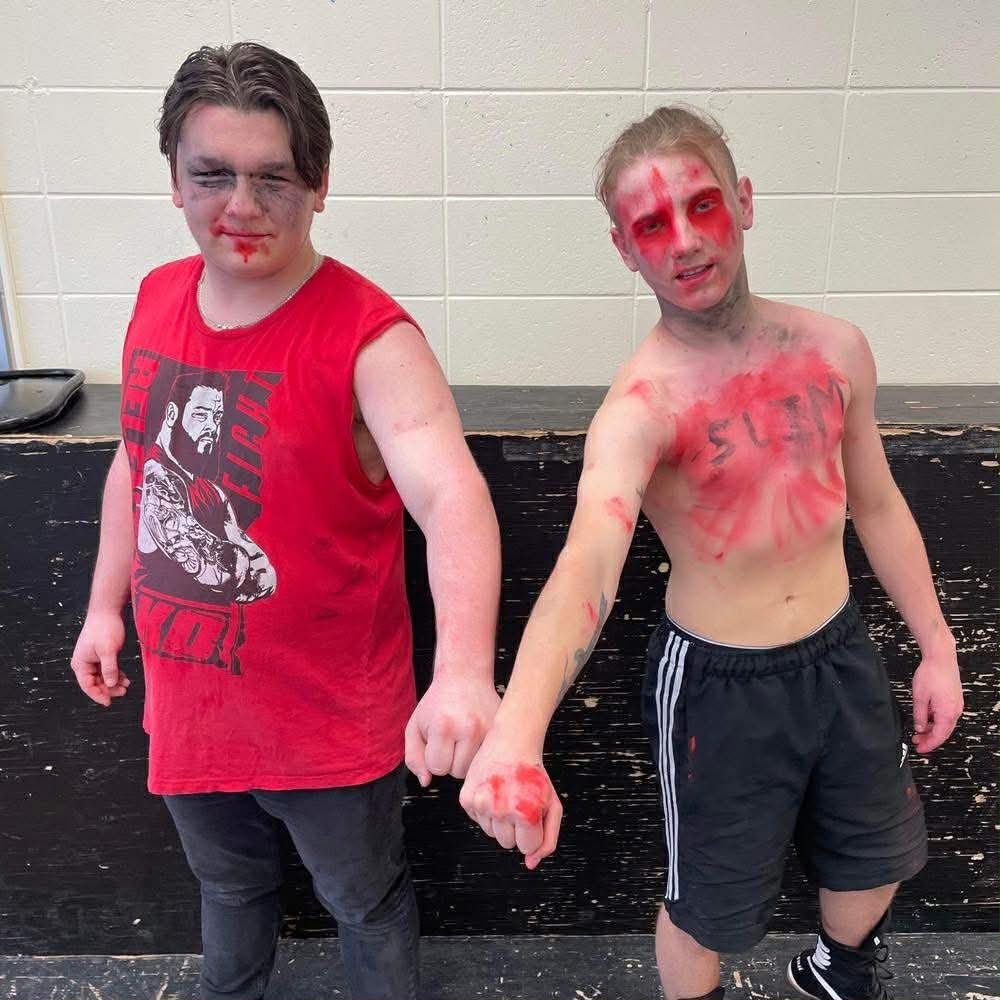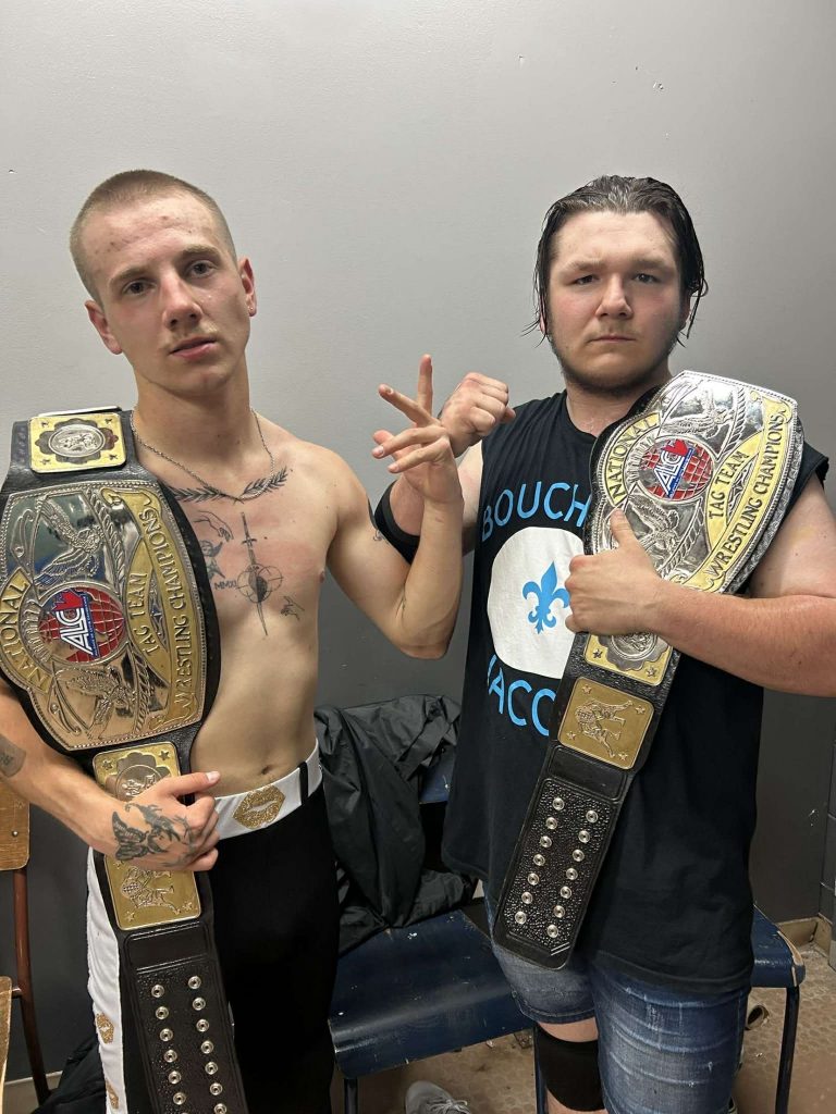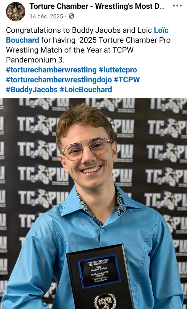 Loïc: Donc quand j’ai connu Buddy notre rêve c’était de devenir champions par équipe. Je sais pas si il voulait faire de la lutte plus tard, mais je lui ai assurément donné la passion et ça finit qu’on s’est inscrit à Torture Chamber en 2023 ensemble. On a fait 3 matchs au secondaire sur une planche de bois en art dramatique devant des personnes et ça nous a donné la piqure pour la suite !