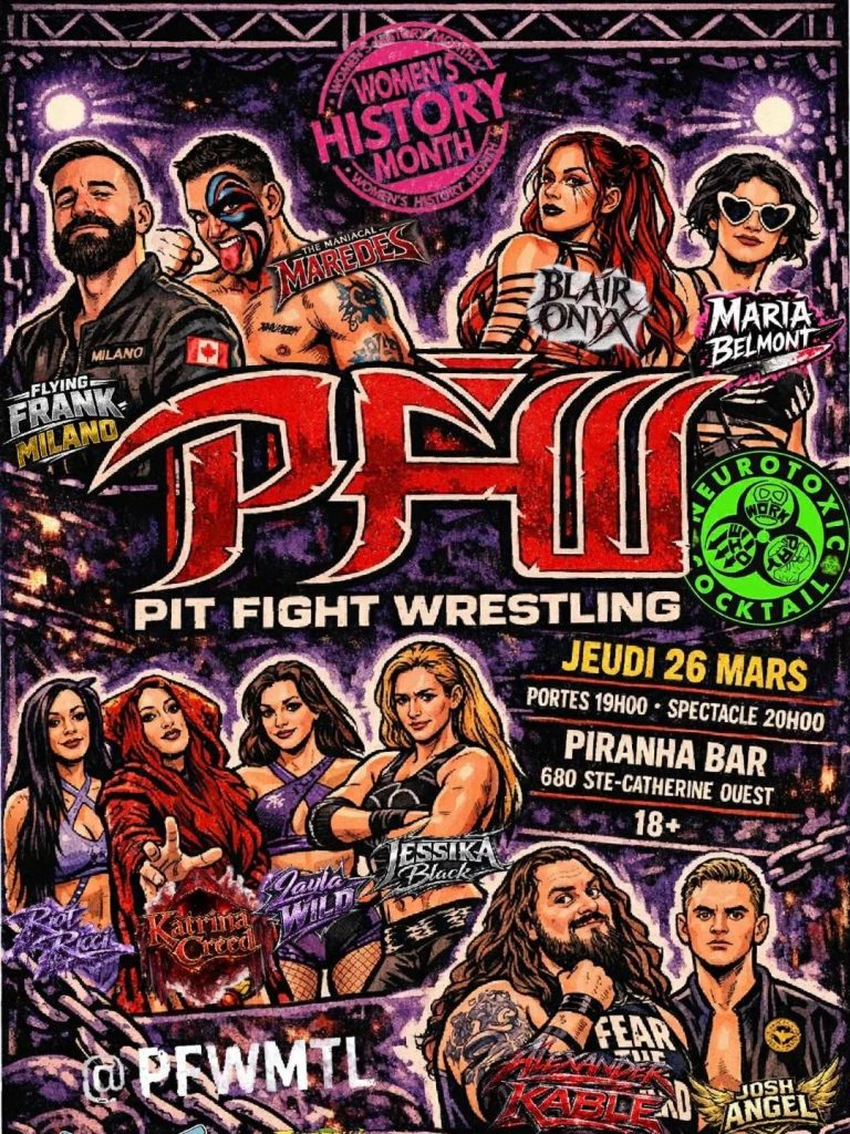 Jeudi le 26 mars, Jonathan Divertissement s’est rendu au Bar Piranha pour assister au deuxième spectacle présenté par la Pit Fight Wrestling. Ce fut, encore une fois, une soirée aussi brutale que divertissante!